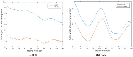 Roll and pitch angles of camera obtained from the IMU and horizon line.