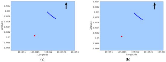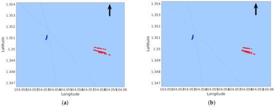 Obstacle mapping result of Seq-2. The red points are the reconstructed feature points from obstacles; The blue curve represents the trajectory of our USV; The arrow points to the direction of North. (a) Triangulation using one frame pair; (b) triangulation using ten frame pairs.