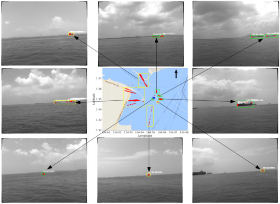 The resulting obstacle map with Seq-3 is shown in the middle figure of Figure 11, and the corresponding obstacles in the original images are shown in the surrounding figures. This obstacle map is obtained with and a range limit of 3000 m. It can be seen that some of the stationary obstacles can be effectively mapped after a full travelling loop of the USV. In Figure 11, the bottom-left image shows a stationary buoy with a measured distance of around 100 m, and its corresponding points in the obstacle map have a very small variance, due to the fact that, as distance decreases, the strength of the detected features become stronger, and the feature matching becomes more accurate. The images in the middle-right, top-right, and top-middle show stationary tankers and boats with a distance to the USV of around 500 m, and these obstacles demonstrate larger but acceptable variances in the obstacle map. A large container ship is shown in both the bottom-middle and top-left images with very large distances (>1000 m) to the USV, and they are mapped with very large variances, because the detected features from the distant obstacles are very weak and cannot be easily matched correctly, resulting in unreliable distance estimation. A similar case also appears in the middle-left image, which shows the scenario of the seashore. A moving obstacle case is illustrated in the bottom-right image, which contains a fast moving boat with a computed distance of around 500 m; however, by visually comparing this boat with the stationary tanker (an estimated distance of around 500 m) on the left of this image, one can observe that the moving boat is much farther away from the USV than the tanker, so the mapped points from this moving boat are not reliable.