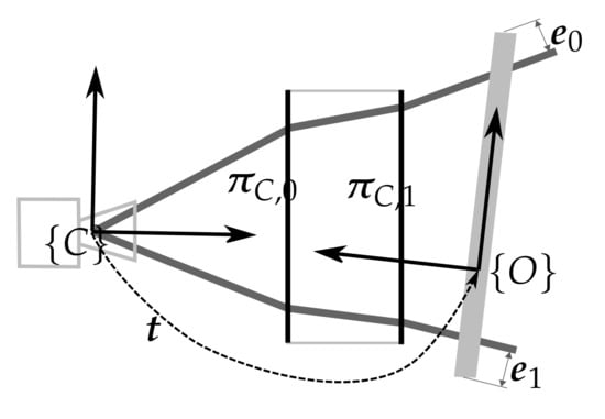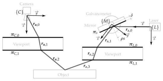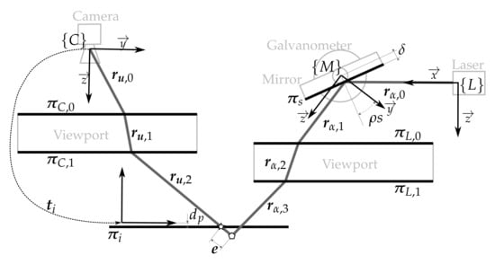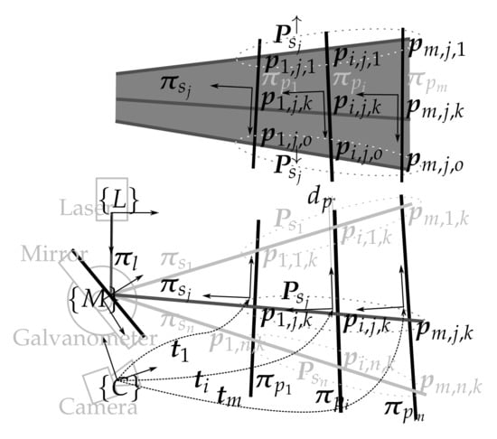 The laser scanner model that describes the sensor is depicted in Figure 3 and consists of: (1) the laser pose with respect to the camera ; (2) the mirror-galvanometer model where is the galvanometer mechanical step (the rotation of the mirror plane around the axis of the mirror frame can be computed using the step s and ), is the mirror surface distance to the mirror rotation axis and is the transformation from the camera frame to the mirror frame; (3) the laser viewport with central plane and thickness representing the two laser viewport interfaces and ; (4) the camera model with the pin-hole parameters and the radial and tangent distortion parameters; and (5) the camera viewport representing the two camera viewport interfaces and .