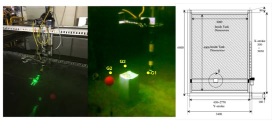 Water tank with the six DoF robot arm mounted on the head of the Cartesian manipulator (left); underwater scene with the three way-points defined for the experiment (centre; see Section 5.2); sketch of the Cartesian manipulator (right; units in mm).