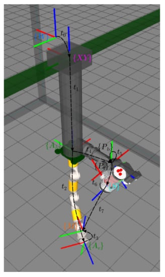 In Figure 9, two kinematics chains linking and the marker are found: (1) defined by the transformations and ; and (2) defined by the transformations , , and . For a given configuration of the arm and the pan and tilt unit, and are known due to the feedback of the arm and the pan and tilt. Moreover, can be estimated using computer vision techniques, as was done in the calibration section (see Section 4.1.4). Hence, the only unknown transformations are , and , and the three of them are constant.