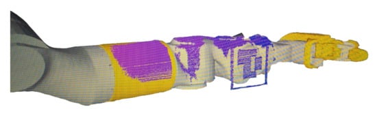 where k is the set of different configurations of arm pan and tilt where each marker was observed. In the same way, the error can be defined in the AUV with a four DoF manipulator to find the two transformations unknown in that system: and . Figure 10 shows a very simple visual confirmation of a correct calibration result. The scanner was used to image the fore arm and the wrist of the eight DoF manipulator. The figure shows how the estimated 3D point cloud overlays the manipulator 3D model, providing an idea about the calibration accuracy.