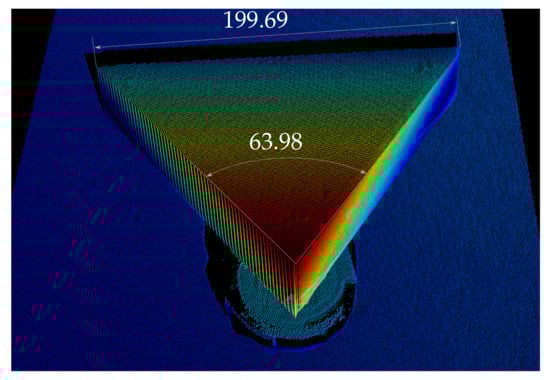 This experiments consists of scanning a triangular prism to assess how accurately the 3D points represent the real object. The prism consist of two 58 degree angles separated 200 mm and a third angle of 64 degrees (see Figure 11). In the experiment, it is positioned in a way that both faces with a respective angle of 64 degrees, as well as the 200-mm edge are clearly visible. Then, this angle and longitude are measured for each one of the reconstructions by manually selecting points in the cloud. In the case of the edge of the prism, two points are selected, while in the case of the angle, an area is selected on each face, and the angle between the two normal vectors of the two selected areas is computed. Figure 12 presents one of the evaluated scans gathered underwater. In the figure, it can be seen how the error of the measurement of the edge is below 1 mm and the error of the measured angle is below 0.1 degrees. This has been done for a total of 10 different positions of the prism. The average error for the 10 different positions of the is 0.53 mm with a standard deviation of 0.27 mm. The angle mean error is 0.072 degrees with a standard deviation of 0.015 degrees.