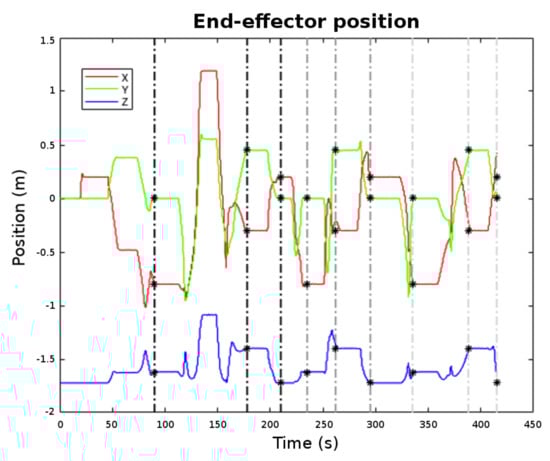Figure 13 shows the end-effector motion along time. The goal way-points are marked with black stars. It can be appreciated from the graph that the arm was reaching each requested goal with accuracy. The end-effector attitude is omitted in Figure 13 as it was kept constant for all three goals during the mission (). Note that the end-effector trajectory changed along the cycles due to the random nature of the RRT-connect path-planning algorithm from one side and due to the fact that during the transit, the environment was being discovered, provoking, sometimes, a trajectory re-planning. Figure 14 shows the arm motion through the working area while it transits for the first time from Way-point 1 to Way-point 2. There, it can be seen how the trajectory stops when the OCTOMAP updates the voxels corresponding to the cup (Frame 4) and how it re-plans to reach Way-point 2 without colliding with the environment. Please see the Supplementary Material for the video of the overall experiment.
