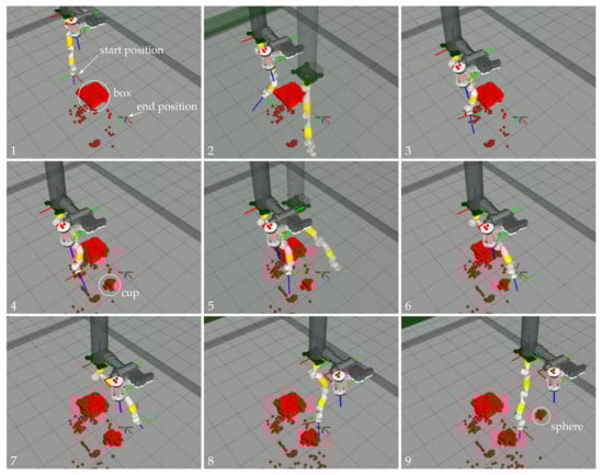 Sequence (1–9) of one of the trajectories of the eight DoF manipulators from Goal 1 to Goal 2. The shadow robot represents the simulation of the robot following the computed trajectory.