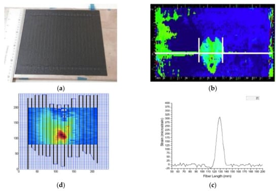 Detection of delamination caused by impact. (a) Composite laminate with optical fiber following parallel paths; (b) ultrasonic C-scan of the impacted laminate; (c) strains measured by optical backscatter reflectometry (OBR) along the white line of the upper figure; (d) strain plotting at the delaminated area, obtained by parallel optical fibers.