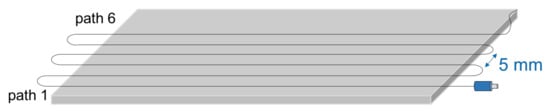 Several identical CFRP 16-ply laminates were built from UD prepreg material by OOA procedures, with the layup (04, 904)s. This special layup sequence was used for simplicity, to have only two delamination interfaces; nevertheless, the concept also works for any general laminate. Dimensions of the cured laminate were 200 mm × 100 mm. An optical fiber was bonded at the surface of the cured laminate, as sketched in Figure 3.