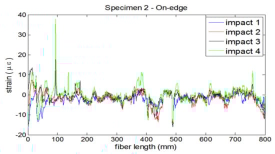 Strains recorded by OBR on the optical fiber after successive impacts of increasing energy, from 2 to 5 joules. The two identifiable peaks recorded at 100 and 400 mm are for the first and second loops of the optical fiber, at a distance to the edge of 5 and 10 mm, respectively.