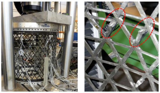 (Left) Isogrid structure under compression test. (Right) Detail of broken bars after exceeding the maximum load.