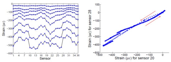 Further details on this and the prior experiment can be found in Dr. Sierra’s thesis [25], including improvements to the PCA algorithm, such as the nonlinear PCA, the use of neural networks to classify load cases, and the results obtained for the same experiment when a strain distributed sensing system was used instead of multipoint FBGs (many more strain measurements were collected, thus higher resolution was achieved).
