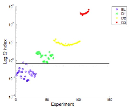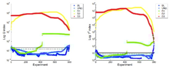 The application of the PCA algorithm to the former dataset is straightforward, with quite good results (Figure 9). It is worth mentioning that there is no need to prepare the data or a finite element model, only to arrange the X matrix (36 × 800). There were 36 sensors, and 800 measurements were taken to generate the baseline. The next measurements, projected on this baseline, easily discriminated the load that produced the first failure, and after that, the next measurements had a clearly detectable damage index.
