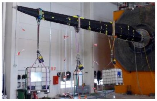 The second difficulty comes from the nature of the inflicted damage. To do a representative experiment, the typical damage that happens to a wind turbine blade (WTB) was reproduced; that is, a partial debonding of the shells at the trailing edge, as marked in Figure 11. A blade 13.5 m long, manufactured in the conventional way as a long spar with two bonded shells, was instrumented with four optical fibers with six FBGs each, regularly spaced. For a cantilever beam under flexural loads, partial trailing-edge debonding changes the torsional stiffness, but does not strongly alter the bending stiffness.