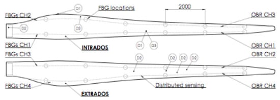 - Guemes, A.; Fernandez-Lopez, A.; Díaz-Maroto, P. A permanent inspection system for damage detection at composite laminates, based on distributed fiber optics sensing. In Proceedings of the 8th International Symposium on NDT in Aerospace, Bangalore, India, 3–5 November 2016. [Google Scholar]