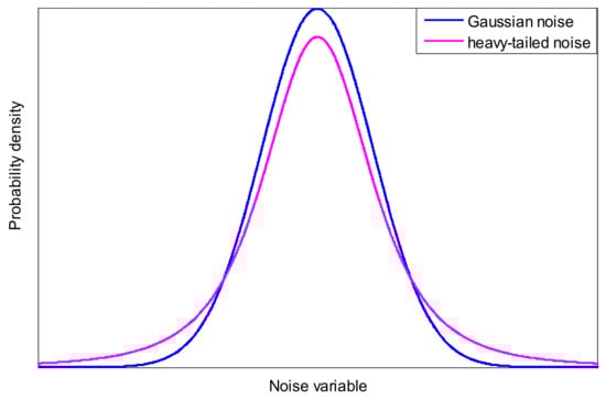 Assumption 1 is given according the affine transition nature of Student’s t variables []. Assumption 2 is commonly used in GM-PHD filters. Assumption 3 is given in the presence of process and measurement noises with heavy tails, so it is reasonable in actual applications, i.e., when using unreliable sensors or sensors suffer from electromagnetic interference while tracking some agile targets, where both process noise and measurement noise are prone to show a heavy-tailed character. For illustrating this, a one-dimensional heavy-tailed noise distribution and Gaussian noise distribution are given as Figure 1.