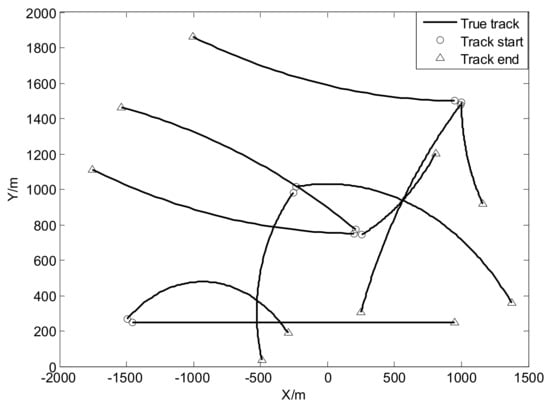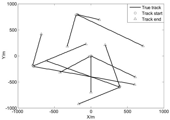 Consider a two-dimensional scenario where there are twelve targets over region × during the interval of 100 s. Assuming no target spawning and each target moves as a constant velocity model similar to [] with: