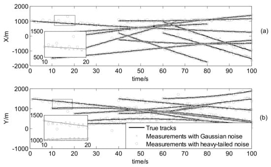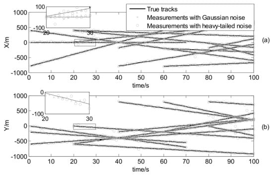 where , , and , and . The true trajectories of each target are shown in Figure 2, while Figure 3 plots these trajectories with Gaussian measurements and heavy-tailed measurements over time (not plot clutter in figure). From Figure 3, it is can be seen that the individual heavy-tailed measurements obviously bias the true position compared with the corresponding Gaussian measurements, which may degrade the estimation accuracy.