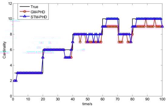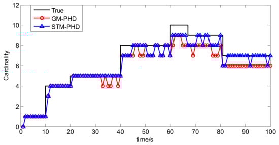 In Figure 5 the OSPA distance of the STM-PHD filter is lower than that of the GM-PHD filter. Especially after 40 s more targets appear, difference of the OSPA distance between two filters is more noticeable. The main reason is that the STM-PHD filter has more accurate cardinality estimation.