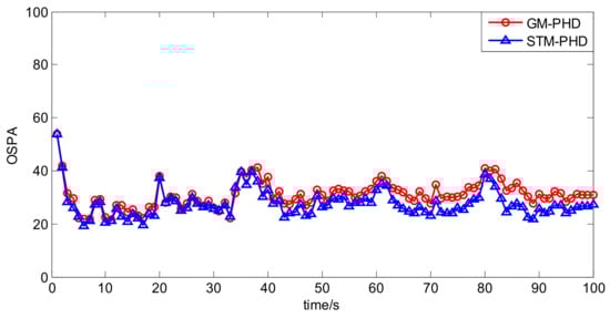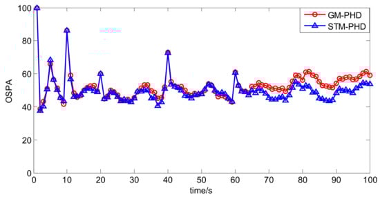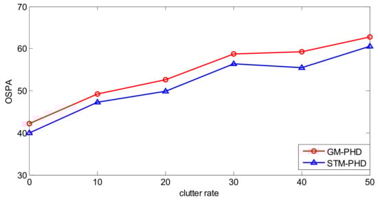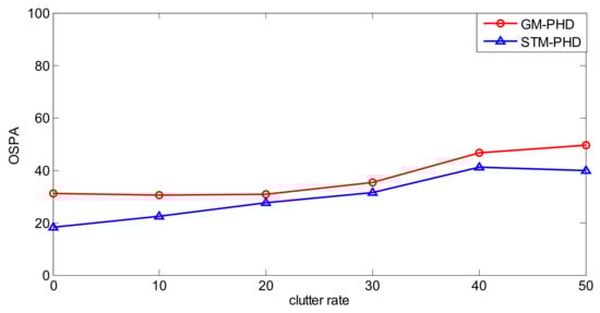To further evaluate the performance of the proposed filter, a simulation is performed over 100 MC trails with different clutter rates from λc = 0 to λc = 50. The resulting time averaged OSPA distances of the proposed filter and the GM-PHD filter are shown in Figure 7. It can be seen that the time averaged OSPA distances of two filters increase with the increasing clutter rate and the time averaged OSPA distance of the STM-PHD filter is always lower than that of the GM-PHD filter under different clutter rates. This means that the STM-PHD filter generally outperforms the GM-PHD filter when outliers exist, no matter what the clutter rate is.