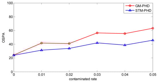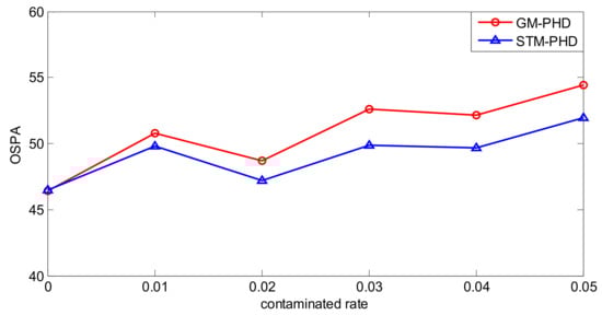 To evaluate the performance of the STM-PHD filter sufficiently, simulation is performed over 100 MC trials with different contaminated rate from to . Then the time averaged OSPA distances of the STM-PHD filter and the GM-PHD filter are shown in Figure 12.