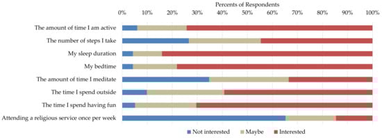 A total of 233 individuals completed the survey (90%: 18–24 years old; 5%: 25–29 years old; and 5%: over 30 years old). We observed similar trends of interest for each of the four outcome variables (see Figure 1 for an example). The most popular independent variable was sleep duration (81–84% of the participants said they are interested), followed by bed time (77–81%), active time (64–74%), and amount of time spent having fun (57–70%). The least popular independent variable was attending a religious event once a week (14–20%), followed by the amount of time meditating (29–33%). The most popular self experimentation was “Does my sleep duration affect my productivity?” (84% interested).
