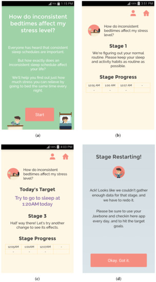 - Daskalova, N.; Metaxa-Kakavouli, D.; Tran, A.; Nugent, N.; Boergers, J.; McGeary, J.; Huang, J. SleepCoacher: A Personalized Automated Self-Experimentation System for Sleep Recommendations. In Proceedings of the 29th Annual Symposium on User Interface Software and Technology, Tokyo, Japan, 16–19 October 2016; pp. 347–358. [Google Scholar]