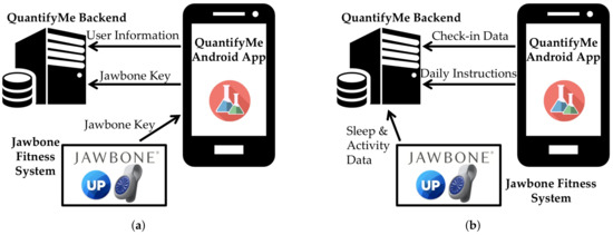 QuantifyMe platform schematics during: (a) installation; and (b) self-experiment. Note that the Jawbone Fitness System includes the Jawbone backend, the Jawbone Up App, and a Jawbone UpMove tracker.