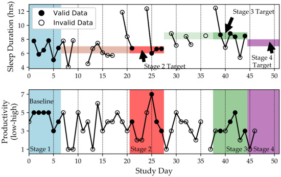 The results of the self-experiment shown in Figure 5 would be computed as follows. Productivity scores on Days 1–6 would be averaged and form the baseline productivity. The productivity scores on Days 21, 25, 26, and 27 (days when the participant achieved the target sleep duration: 6.5 h) would be averaged and form the Stage 2 productivity score (i.e., productivity when sleep duration is 6.5 h) since during those days the participant was able to adjust their sleep behavior to the target goal of 6.5 h of sleep. Similarly, Days 39, 41, 42, and 44 would be averaged to form the Stage 3 productivity score (i.e., productivity when sleep duration is 8.5 h) and, if Stage 4 were completed, the days where the sleep duration was in the target range would be used to compute the average productivity for 7.5 h of sleep. These four scores (baseline and Stages 2–4) would then be compared to determine the highest productivity. The corresponding sleep duration would be reported to the participant as their personalized optimal sleep duration for achieving high productivity.