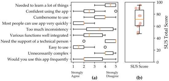 Results of the System Usability Scale: (a) the distribution of responses for each question; and (b) the distribution of the SUS total score.