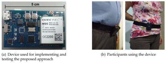A second device was developed for validating our methodology (Figure 1). This device consisted of the same microcontroller and sensor used for SisFall, but it included a GPRS transmitter (to send short text messages—SMS) that was activated if a fall was detected. As we did with the first device, it was fixed with a homemade belt (see the supplementary videos of [11]) to guarantee that it did not move relative to the subject. The device did not need to be in a completely vertical position, nor did it require additional calibration once the subject was wearing it.