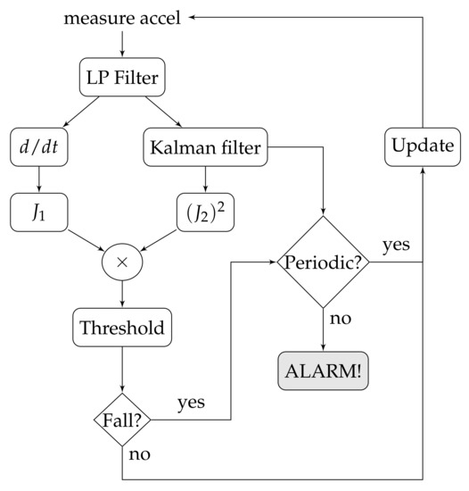Figure 2 shows a schematic of the proposed approach. It includes bias variations of the signal together with acceleration peaks. This increases the robustness of the feature extraction and allows for simpler classifiers. The proposed methodology consists of four stages: preprocessing, feature extraction, classification, and periodic activity detection. For each time sample k, the raw acceleration data is initially low-pass-filtered. It then splits into bias removal and Kalman filtering, which feeds both features and , respectively (see Equations (8) and (9) below). A threshold-based classification is performed over a non-linear indirect feature. If the resultant value crosses the threshold, the periodicity of the signal (extracted from the Kalman filter and a zero-crossing algorithm) is analyzed in order to determine if it is a false fall alert or if indeed the alarm should be turned on. This methodology is explained in the following section.
