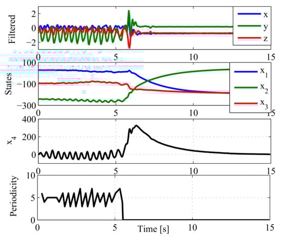 This strategy only requires sintonizing two parameters when the Kalman filter is set up: the variance matrices Q and R. There are no rules to determine their values, but they are not difficult to define of this particular problem. Both are usually diagonal (no interaction among states), and large values of Q and R tend to the original data: , and they are also complementary, i.e., the states are flattened when any of them are reduced. As shown in Figure 3 (second and third panels), the first three states are flat (inclination of the subject), and the fourth one seeks periodic (sinusoidal shape) waveforms.
