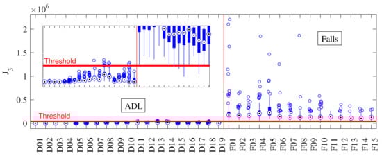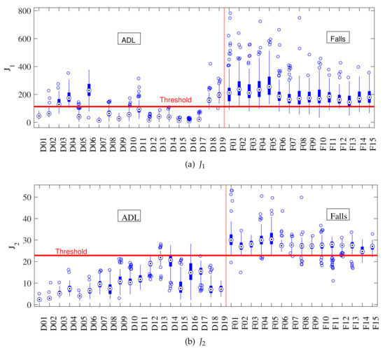 Figure 4 shows activity-by-activity analysis boxplots of and . The horizontal red line is the threshold for the best accuracy value and the vertical red line divides ADLs and falls. The indexes of the activities can be found on [11] (Tables 1 and 2). By comparing (Figure 4a) and (Figure 4b), we observe that largely fails in periodic ADLs (D03, D04, D06, D18, and D19 from [11] (Table 2)), while does not. advances closer to the threshold in activities where does not (D16 for example).