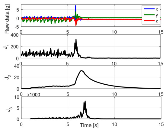 where is a sliding window with the last N values of the corresponding feature. This window is necessary as the Kalman filter takes some time to achieve the maximum, i.e., both metrics do not always present a maximum at the same time. The objective of this product of features is to amplify the values of those activities where both features agree and to minimize those where both features disagree (see Figure 5, bottom panel). The square of prioritizes it over , as it is more accurate [11]. Figure 5 shows both features with the jog–trip–fall example of Figure 3. The maximum values during jogging are half of those of the fall of , but clearly become distant in .