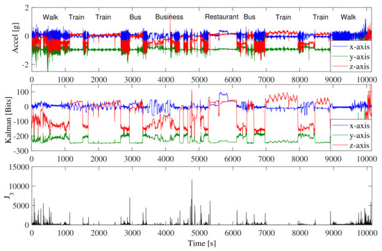 Figure 8. SM03’s trip downtown. (top panel) Raw acceleration data, 2 h and 45 min of recording. (second panel) First three states of the Kalman filter. (third panel) Feature . It was always below the threshold (set at 40,000). Data recorded and processed with the embedded device of Figure 1.