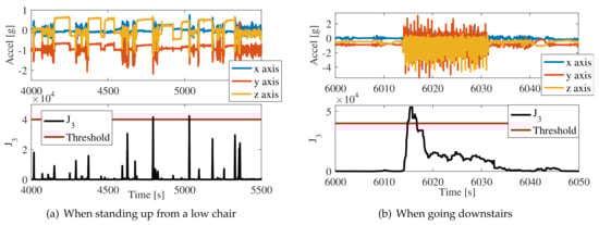 - SM01 had nine false positives during the recordings. Four of them were generated when she stood up from a low chair or from the sidewalk. As shown in Figure 9a, she would stand up fast and her acceleration was close to the threshold. Another two false positives were generated when going downstairs (see Figure 9b). The final three false positives were undetermined, but are presumed to be due to direct impacts to the device.