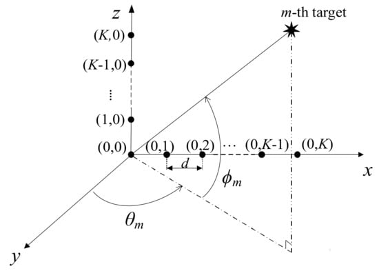 where ωc denotes the carrier frequency, μ is the rate of change of the instantaneous frequency of a chirp signal, and Tsym is the duration of chirp signals. Then, the bandwidth of the FMCW chirp signal is defined by B = μTsym/2π. Consider M far-field, non-coherent, narrowband sources impinging on the L-shaped array with 2K + 1 omnidirectional sensors as shown in Figure 1. The array on the x- and z-axes consists of two uniform linear sub-arrays with element spacing d, each being composed of K + 1 elements.