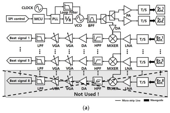 Figure 3 shows the configuration of the transmitting and receiving antennas; the transmitting antenna is located on the upper side of system, and the receiving antenna is on the lower side. The RF front module is designed to be able to obtain the signals from the receiving antennas through a rectangular waveguide interface.