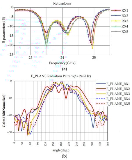 The antenna operates over the frequency range of 24.025 to 24.225 GHz for the FMCW radar signal bandwidth as shown in Figure 4a. Figure 4b shows the simulated receiving antenna radiation pattern; in this case, the antenna is designed to face forward. The return loss and radiation pattern in Figure 4 are simulated together with the waveguide, transition, and meander feeding line. The antenna characteristic is optimized for radar performance with adjacent antennas and discontinuity of structure, although it is possible to improve the antenna characteristic.