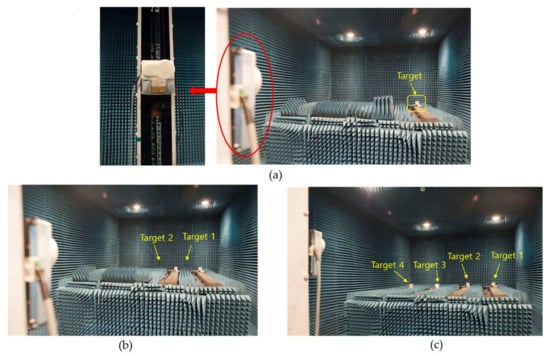 This section describes several indoor experiments, which were conducted to detect one target, two targets, and four targets, respectively, in the microwave anechoic chamber of Daegu Gyeongbuk Institute of Science & Technology (Daegu, Korea). One outdoor experiment was also carried out to verify the performance of the proposed algorithm in a realistic scenario.