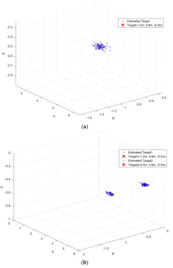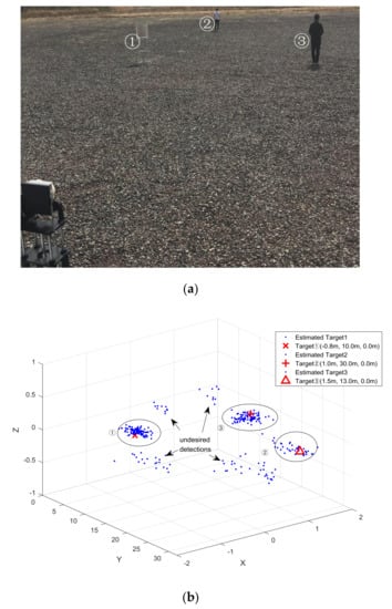 As shown in Figure 9a, the radar module was set up on a holder, and the inflection point of the L-shaped antenna array was arranged as the origin at a height of 1 m from the ground. We then arranged three targets: (1) Iron target in (−0.8 m, 10 m, 0 m); (2) Human target in (1 m, 30 m, 0 m); (3) Human target in (1.5 m, 13 m, 0 m). We tried to arrange the center of the targets at around 1 m height from the ground, and hence we put ‘0 m’ here for the three targets. It can be noted that the ground is besprinkled with little stones with various shapes, which contribute much interference for the estimations.