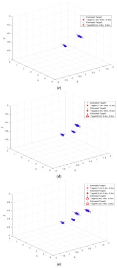 We conducted 100 trials for each experiment, and the estimated positions are illustrated in Figure 8a–e, respectively. Root mean square error (RMSE) was selected as the measurement of the experiment results, and we defined the RMSE for each target as , where denotes the estimated position of the target (x, y, z) from the l-th trial. The measured RMSE values for all experiments are shown in Table 4.