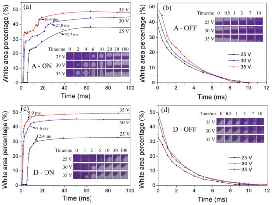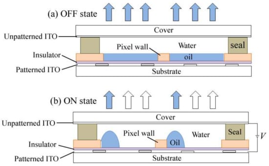 Without voltage (Figure 1a), oil covers the hydrophobic insulator surface inside the pixel, which is the off state of the EFD. When a voltage is applied to the electro-fluidic pixels (Figure 1b), the electrostatic force drives conductive liquid (water in our case), wetting the insulator surface, and pushing the oil motion. The oil motion during the on-switching process presents the optical response of the EFD, which could be characterized by the change in the white area percentage (WA) [].