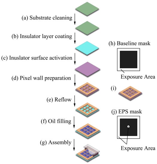 As shown in Figure 2a, the substrate glass with ITO layer was cleaned. Then amorphous fluoropolymer was spin-coated on the surface of the ITO layer of the glass substrate (Figure 2b) with a thickness of around 850 nm and baked on a hotplate for 3 min at 100 °C. A further curing process by heating in an oven at 180 °C for 30 min was conducted for completely removal of the solvent. Photoresist layer was spin-coated on the surface after a hydrophilic treatment of the fluoropolymer layer by a reactive ion etching process (Figure 2c). Then, a standard lithography process was carried on to fabricate the pixel wall and pinning structures (Figure 2d) with five different designed lithography masks with (central EPS as an example, Figure 2j) or without EPS design. The prepared pixels with central EPS design were illustrated in Figure 2i. After the lithography process, a thermal reflow process (Figure 2e) at 200 °C for 2 h was applied to restore the hydrophobic fluoropolymer layer []. The thickness of the pixel wall after the reflow process was around 5.6 μm, while the thickness of the pinning structure was 5.8 μm. The periodic length of each pixel was 165 μm, and the width of the pixel wall was 13 μm, while the diameter of the pinning structure was 15 μm. Then, along with the oil filling into pixel (Figure 2f), water and oil was sealed between the substrate and the cover by the pressure sensitive adhesive (Figure 2g).