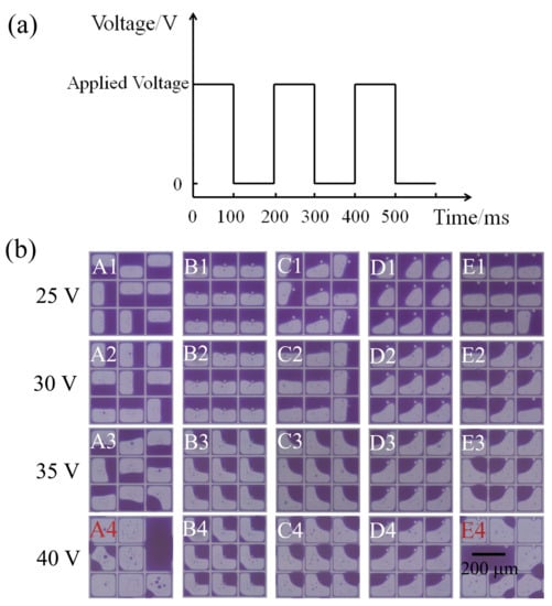 A high-speed camera (MIRO M110) with a speed of 2000 fps was used to observe the switching process of pixels at different voltages (25 V, 30 V, 35 V, and 40 V). The applied voltage was provided and controlled by a waveform generator (Agilent 33500B Series, Loveland, CO, USA) with a square wave of 5 Hz frequency.