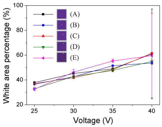 As shown in Figure 5, the white area percentage (WA) rises with increasing applied voltage for all the samples. The data indicates that the introduction of the EPS into the pixel brings no obvious influence in aperture ratio, which can be explained by the tiny relative volume and high transparency of EPS. With applied voltage increasing up to 40 V, a jump in error bar can be observed for samples A and E, which is caused by the occurrence of oil overflow corresponding to A4 and E4 in Figure 4b. Considering the function of the oil overflow suppression presented, pixels with EPS may gain a higher aperture ratio with high applied voltage. Because it was limited by the maximum output voltage (40 V), the enhancement of the aperture ratio by the EPS was not investigated here.