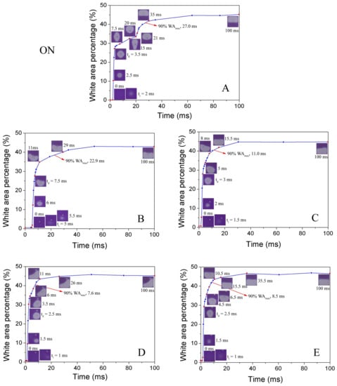 Comparison of optical response of pixel switching on process for base line pixel without EPS (A) and pixels with different EPS distributions (B,C,D,E), applied voltage = 30 V.