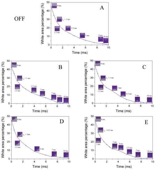 The switching-off process can be separated into two stages: oil wetting (tw) and oil reforming (toff). After switching-off, the contracted oil starts to spread spontaneously, which is driven by the stored surface potential converted from electric field energy []. When the merging of oil droplets occurs, an oil reforming process becomes dominating the off-process dynamics. The slow decay process can be described by a capillary surface reforming dynamics of thin films. The comparison of optical response of pixel switching off process for base line pixel and EPS located pixels is presented in Figure 7. It indicates that all the structures have a short wetting time (0.5–1 ms, Figure 7), and the oil reforming process is the critical factor of the response time for off switching. Considering the fact that the small volume of the EPS compare to pixel size, the extra capillary brought is relatively small. Thus, the introducing of an EPS should bring no obvious influence on off-switching response, which is proved by experimental data shown in Figure 7 and Table 2.