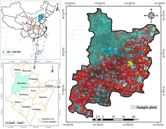 Shenzhou City (37°42′–38°11′ N, 115°21′–115°50′ E) belongs to the county-level city in the west of Hengshui City, Hebei Province, China (Figure 1). The study region (which covers approximately 1252 km2) is located in the Huang-Huai-Hai Plain of China, which is a major commercial crop planting area dominated by winter wheat and corn in rotation. This area has a warm temperate sub-humid continental monsoon climate with high temperatures and precipitation concentrating in summer, and low temperatures and drought mainly in winter. The soil types mainly consist of the fluvo-aquic soil, wet fluvo-aquic soil, and sandy fluvo-aquic soil. Due to the suitable conditions of soil, climate, and adequate irrigation from groundwater, this study area is suitable for growing winter wheat, cotton, and corn. The terrain of this area is alluvial plain, and the topography owns the characteristics of being relatively flat and tilts slightly from the southwest to northeast. The average elevation ranges from 16 m to 29 m. The area of winter wheat occupies 667.53 km2 (approximately 53.32% of the total area). According to our field observations in this region, winter wheat is usually sown in early October and harvested in early or mid-June of the following year.