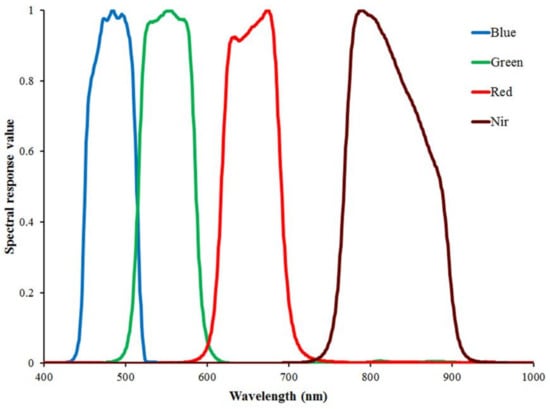 A series of pre-processing for GF-1 images was performed using the ENVI 5.1 software that mainly included radiometric calibration, atmospheric correction, and geometric correction. The apparent radiance was calculated from the digital number (DN) with the calibration coefficients from the CRESDA (Table 1). The atmospheric correction was performed by the fast line-of-sight atmosphere analysis of spectral hypercubes (FLAASH) model in the ENVI software, which includes a RTM of moderate resolution atmospheric RTM (MODTRAN) 5.0 [56]. The required spectral response functions were also from the CRESDA website (Figure 2). The geometric correction was performed with three steps. First, ortho-rectification was performed using the geo-location attached to the GF-1 images and digital elevation model (DEM) with a 30 m resolution. Then, using 30 ground control points (GCPs) collected from Trimble GeoXT3000 GPS observations, the preliminary geometric images were geometrically rectified. Finally, the corrected image from 14 April was used to rectify the other image from 25 May, and the final registration accuracy was less than half a pixel. In the geometric correction, the second-order polynomial transformation with the nearest-neighbor method was used to resample the images in the same resolution. The projection and coordinate system were set as the Universal Transverse Mercator Grid System (UTM) and the World Geodetic System 1984 (WGS84), respectively [11].